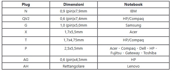 Uscite: 9,5V (3,3A), 12,0V (3,3A), 15,0V (2,5A), 18,0V (2,1A), 19,0V (2,1A), 20,0V (2,0A).