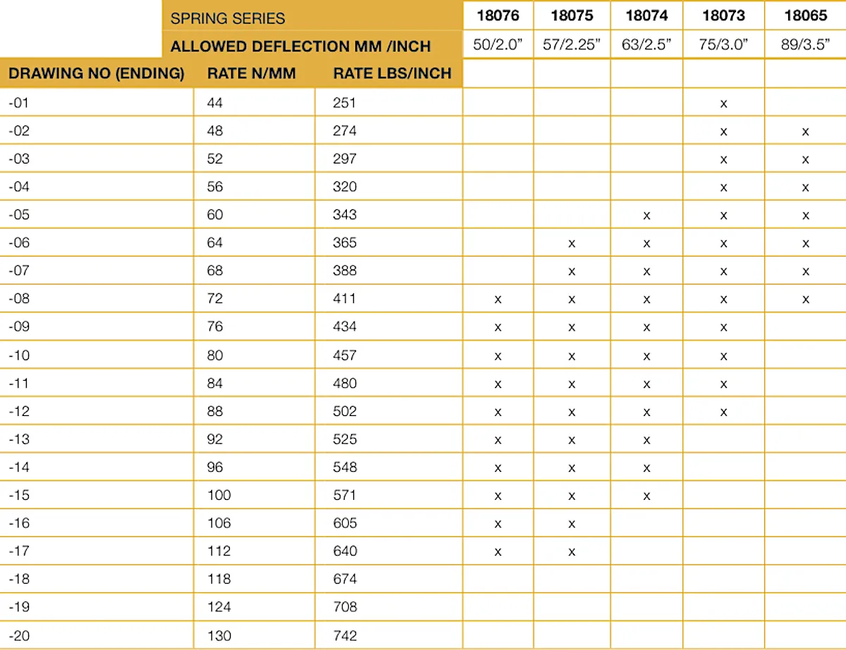 Le molle leggere della serie 18074-05 bis -15 sono progettate per l’ammortizzatore idraulico TTX 22 M universale con l’articolo no. MTB 1691 e MTBM 1895.