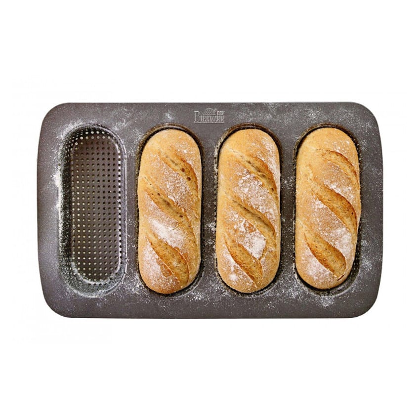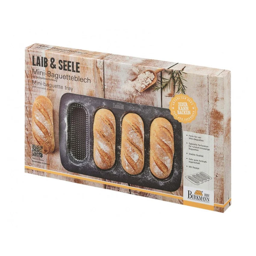 Stampo robusto e di qualità per 4 mini baguettes, appositamente forato per favorire la lievitazione ed ottenere pagnotte perfettamente croccanti. Rivestimento dalle ottime caratteristiche antiaderenti.